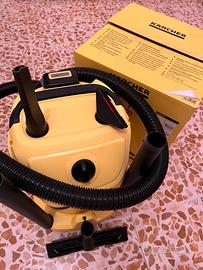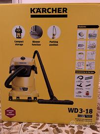 Bidone aspirapolvere, aspiraliquidi e soffiatore senza filo completo di batteria, caricabatteria e accessori (tubo 2 mt, spazzola, bocchetta per fessure e bocchetta per tappezzeria) con sistema di stoccaggio salvaspazio.