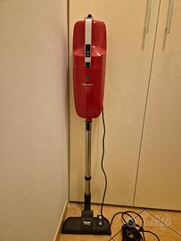 Molto potente, aspira benissimo, molto robusta. Con sacchetto, filo molto lungo, velocità regolabile, modalità spazzola pavimento ore tappeto. Manca la scatola originale e la parte terminale del manico. Funziona anche montando il motore in alto come in foto in modo da usare l'impugnatura rossa