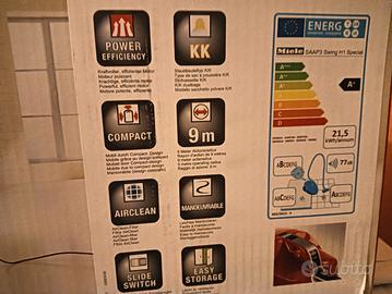 aspirapolvere Miele Swing H 1 Eco Line potente, maneggevole,leggero, cavo lungo 9 MT, con sacchetto ,modalità spazzola pavimento e tappeto .Il motore si può montare basso , come da foto o in alto , direttamente al manico. classe energetica A+ perfettamente funzionante ,dotato di scatola originale.