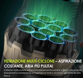 Potenza di Aspirazione 48KPa con Motore Brushless da 550W: Il motore brushless ad alte prestazioni genera una potenza costante di 48Kpa, rimuovendo polvere fine, peli di animali, briciole e sporco ostinato in un’unica passata. Perfetto per pavimenti duri, tappeti e divani, garantisce una pulizia rapida ed efficace in tutta la casa.