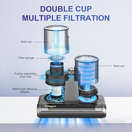 【Doppio serbatoio della polvere e sistema di filtrazione a 6 livelli】: Il dispositivo per la rimozione degli acari dai materassi è dotato di filtro HEPA, che cattura particelle fino a 0.3 micron, con una efficienza di filtrazione del 99.97%. Questo impedisce ostruzioni e garantisce prestazioni ottimali a lungo termine. Dotato di due grandi serbatoi della polvere lavabili, separa polvere e gas, sigillando strettamente la sporcizia per prevenire inquinamento secondario.
