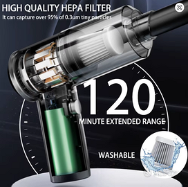 【Aspirapolvere portatile 5 in 1】 Questo aspirapolvere portatile senza fili non è solo un aspirapolvere, un asciugacapelli, ma anche un aspiratore di polvere d'aria.Il design dell'aspirapolvere è squisito; l'estremità anteriore dell'aspirazione della polvere e l'estremità posteriore del soffiaggio della polvere offrono un'esperienza di pulizia efficiente.Con un'aspirazione fino a 15.000 Pa, i nostri mini aspirapolvere sono sufficienti per soddisfare le tue esigenze di pulizia di polvere di auto o casa, peli di animali domestici e detriti difficili da pulire, rendendo la pulizia e l'organizzazione un gioco da ragazzi.È lo strumento perfetto per spolverare, pulire le tastiere, gonfiare l'attrezzatura da esterno ed estrarre l'aria dalle borse di stoccaggio, sempre e ovunque 【Ricarica USB senza fili】 Il nostro piccolo aspirapolvere è dotato di una batteria agli ioni di litio da 4000 mAh integrata, che può portare più aspirazione e ricarica completa rapidamente in 1 ora.Il design dell'aspirapolvere portatile senza fili ti consente di muoverti liberamente mentre pulisci scale, cucine, automobili o angoli difficili da raggiungere.Con fino a 90 giorni in standby, la ricarica USB-C garantisce un'alimentazione duratura 【Filtro riutilizzabile e lavabile】 Questo aspirapolvere portatile utilizza un filtro HEPA lavabile e riutilizzabile ed è dotato di una tazza per la raccolta della polvere, un design con guarnizione a cono per catturare 99.7%* polvere e detriti e una tazza per la raccolta della polvere con un design a doppio pulsante per impedire efficacemente l'utilizzo del contenitore per la polvere.Dopo l'uso, il contenitore della polvere può essere smontato con rotazione, la spazzatura può essere rapidamente scaricata ed è facile da pulire e utilizzare la prossima volta.Suggerimenti per l'uso: se il filtro dell'aspirapolvere è pieno di sporco o l'aspirazione è indebolita, pulire il filtro in tempo per garantire che il raccoglitore di polvere possa funzionare normalmente.