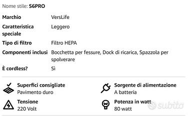 VersLife S6PRO Aspirapolvere Senza Fili, Aspirazione Potente 30KPa, Scopa Elettrica Senza Fili con Design Senza Spazzole, Filtro HEPA, Autonomia 30 Minuti, per Pavimenti e Peli di Animali Domestici se c'è l'annumcio è disponibile no offerte non è trattabile
