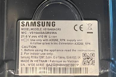 Vendo aspirapolvere senza fili Samsung Jet 60 turbo, modello VS15A60AGR5. L'aspirapolvere è perfettamente funzionante e in ottime condizioni estetiche, come visibile dalle foto dettagliate. È stato pulito e sanificato prima della messa in vendita. Caratteristiche principali: - Motore Digital Inverter da 410W per una potente aspirazione. - Sistema di filtraggio HEPA a 5 strati (ideale per chi soffre di allergie). - Batteria rimovibile da 21.6V. - Contenitore della polvere lavabile e igienico. L'aspirapolvere viene venduto completo di tutti gli accessori originali mostrati nell'immagine d'insieme: 1. Spazzola principale Jet Fit (mostrata assemblata). 2. Mini Spazzola Turbo (Pet Tool): specifica per rimuovere peli di animali domestici da divani e tessuti (mostrata in basso a destra). 3. Lancia per fessure (mostrata a sinistra). 4. Spazzola 2-in-1 per polvere e imbottiti (mostrata in alto a destra). 5. Supporto per l'aggancio a parete con caricabatterie.