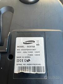 Vendo aspirapolvere Samsung modello SC67G0 funzionante, l’unico difetto è il cestello raccogli polvere , che è un po’ malandato, sia la parte sotto che quella sopra, comunque non perde la polvere.