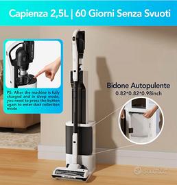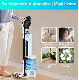aspirapolvere senza fili, con diversi accessori, svuotamento automatico su base di ricarica, doppio caricatore, spazzole e bocchette varie. Semi nuovo con garanzia. Solo consegna a mano.