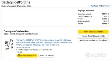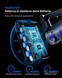 Comprata nuova pochi mesi fa ma alla fine mai utilizzata, aperta e montata solo per fare le foto. Vendo aspirapolvere NUOVA, con SCATOLA ORIGINALE, FATTURA e 2 ANNI DI GARANZIA AMAZON. Aspirapolvere senza fili con motore brushless HyperCore Pro da 600W, potente (fino a 55 kPa) e silenzioso (<62 dB), ideale per rimuovere sporco ostinato da tappeti, pavimenti e fessure. Il sistema DualCore di gestione della batteria garantisce prestazioni stabili e autonomia fino a 70 minuti (modalità pavimento), 40 minuti (tappeto) e 20 minuti (turbo), adattandosi a diverse esigenze di pulizia. Dotato di tecnologia MultiVortex con forza centrifuga avanzata e sistema di filtrazione a 8 strati con efficienza del 99,99%, cattura polvere fine, polline e allergeni. Il filtro HEPA con carboni attivi migliora la qualità dell’aria, rendendo l’ambiente più sano. Il display LED touchscreen intelligente consente controllo facile della potenza, monitoraggio della batteria e notifiche in tempo reale (errore di carica, temperatura, contenitore pieno, intasamenti), per un’esperienza intuitiva e smart. Il doppio sistema antigroviglio con struttura a pettine e setole a V riduce l’accumulo di capelli e peli di animali. La spazzola motorizzata flessibile raggiunge facilmente punti difficili, mentre le luci LED aiutano a individuare lo sporco nascosto. Include diversi accessori per la pulizia multi-superficie: spazzola per divani, spazzola 2 in 1 e bocchetta per fessure, ideali per una pulizia completa di tutta la casa. Aspirapolvere aspiratore senza fili scopa elettrica/aspirateur sans fil/aspirador sem fio/draadloze stofzuiger/aspirador inalámbrico