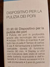 DISPOSITIVO PER LA PULIZIA DEL VISO Pulizia dei pori in profondità grazie alla tecnologia del vuoto Inclusi fitri di ricambio , per tuttii tipi di pelle . Tempo di carica: 5 ore • Alimentazione a batteria ri- caricabile; durata di funziona- mento 90 min. • Display a LED con indicatore dello stato di carica della batteria ricaricabile e dell'intensità • 3 diversi accessori • 5 livelli di intensità NUOVO mai usato