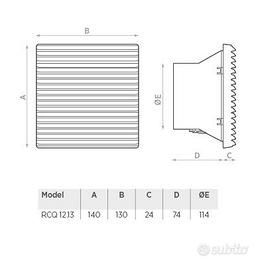 Aspiratore assiale O.ERRE mod RC 12.13 - 220-240V AC 50/60Hz, 15 watt IP44 in plastica ABS autoestinguente con griglia di aspirazione, misura 130 x 140 mm colore grigio RAL 7032, gancio elastico per montaggio a scatto oppure a vite e guarnizione premontata sul dispositivo, 50 m³/h con filtro, 67 m³/h senza filtro, adatto anche alla ventilazione di quadri elettrici. Prodotto nuovo ancora in scatola originale