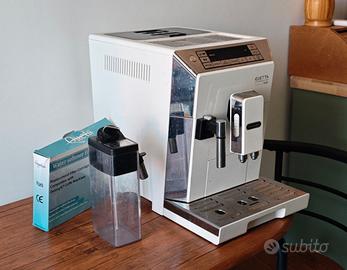 Macchina da caffè automatica De’Longhi Eletta Cappuccino Top ECAM 45.760.W, perfetta per chi ama espresso, cappuccino e bevande a base di latte. Funzionante al 100%, manutenzione regolare (pulizia e decalcificazione), sempre filtro anticalcare. Anno di acquisto: circa 5 anni fa Condizioni: Molto buone, mantenuta maniacalmente. Caratteristiche principali: Sistema LatteCrema per cappuccino cremoso (viene venduto insieme il montalatte) Display LCD con menu dedicati Serbatoio latte con pulizia automatica Classe energetica A Pressione pompa: 15 bar Potenza max: 1450 W Serbatoio acqua: 2 litri Contenitore chicchi: 400 g Macinacaffè con 13 regolazioni