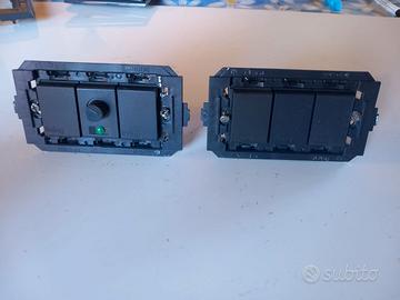 B.ticino living clasic usata (piccoli segni di usura)n2 supporti art.4703 n2 placche art gr4713 (nero/grigio)n5 tappi copriforo art4500 n1 varialuce relco (ticino)art34al