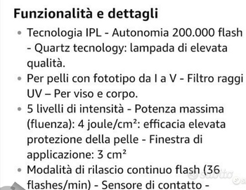 Epilatore luce pulsata con sensore di contatto a 200.000 flash, funzione gliss e tecnologia al quarzo. Compatto e facile da usare, emette flash solo in condizione sicure. Livello di intensità regolabile in 5 livelli in modo da adattarsi a qualsiasi fototipo. Modalità' di rilascio continuo (36 flashes/min), con finestra di applicazione: 3 cm2; bassa frequenza: 4/cm2; alta protezione della pelle. L'epilatore può essere utilizzato per gambe, ascelle, braccia e viso (solo mento, guance e labbro superiore ma non deve essere utilizzato vicino agli occhi).
