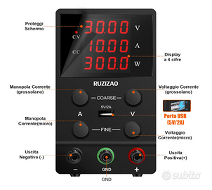 Alta Precisione, Bassa Ondulazione, Display a LED, Spegnimento Automatico in Modalità C.C/C.V: Alimentatore da laboratorio è un regolatore di alimentazione professionale ad alta precisione di 0,01 V e 0,001 A, alimentatore da banco. Il display a LED retroilluminato a 4 cifre ha il vantaggio di una risoluzione ad alta risoluzione. La modalità di tensione costante e di corrente costante possono chiudere automaticamente l'interruttore. Certificazione CE e FCC, Protezione Multipla, Diverse Applicazioni: Gli alimentatore da banco hanno superato le certificazioni CE e FCC. Alimentatore da laboratorio da dispone di diverse funzioni di protezione. Alimentatore da banco è adatta per laboratori, scuole, manutenzione elettronica, elettrolisi, galvanizzazione, test di invecchiamento, fai da te, ricerca scientifica e insegnamento, ecc. Design Verticale Stabile, Leggero e Portatile: Alimentatore da banco ha un design verticale stabile, Alimentatore da laboratorio ha piedini in gomma antiurto nella parte inferiore, in modo che sia più sicuro e stabile durante l'uso. L'alimentazione DC ha una dimensione di soli 24 x 8,5 x 15,5 cm e un peso di soli 1,2 kg. Connettore USB 5 V/2 A, ventola intelligente, materiali di alta qualità: Alimentatore da Banco è dotato di una porta USB 5 V/2 A, che consente di ricaricare il vostro cellulare, tablet o altri dispositivi. Quando la temperatura di funzionamento dell'alimentatore da laboratorio supera i 122 °C e i 50 °C, la ventola si accende automaticamente. I materiali di alta qualità rendono il nostro alimentatore da banco DC più durevole.