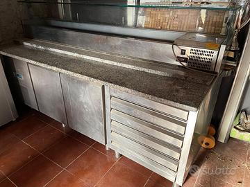 Vendo banco frigo pizzeria usato, piano in granito, incluso di vetrina refrigerata. 2 Sportelli e 6 cassetti. Non è prevista la consegna, solo ritiro di persona.