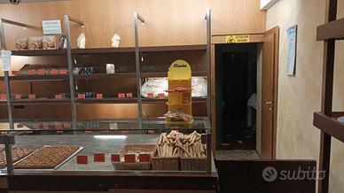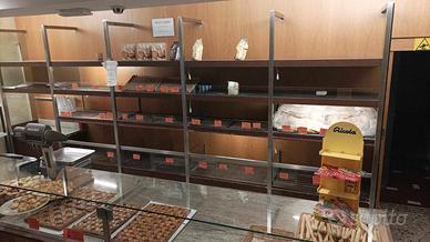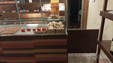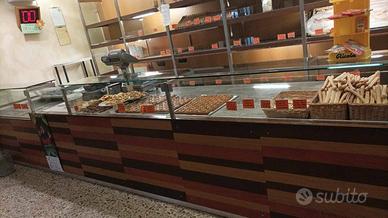 banco pasticceria panetteria pizzeria al taglio con frigorifero sottostante ad arredamento retrostante con scaffali euro 3500 più Iva visto e piaciuto smontaggio a carico del acquirente
