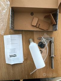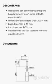 NUOVO MAI USATO DISPENSER SAPONE DA PIANO DESCRIZIONE: - distributore da incasso con contenitore per sapone liquido/detersivo con carica dall’alto, capacità: 0,5 l - dim. contenitore: ø 65×200 h mm - base dispenser: ø 45 mm - foro dispenser: ø 35 mm - installabile su top con spessore minore o uguale a 65 mm