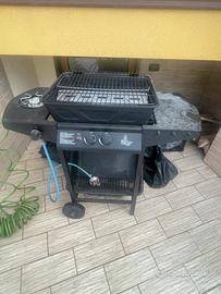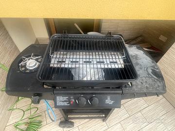 Vendo barbecue a gas con doppio bruciatore centrale e fornello laterale, perfetto per grigliate all’aperto.