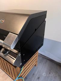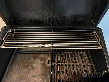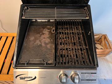 Vendo barbecue a gas Turbo Outdoor – serie Classic, modello 2 bruciatori, di ottima qualità e costruzione robusta. Il barbecue è perfettamente funzionante e in buono stato generale. Struttura in acciaio inox con coperchio dotato di termometro, ideale per cotture indirette. Caratteristiche: 2 bruciatori a gas Griglia in ghisa + piastra in ghisa (ideale per carne, verdure, pesce) Coperchio con termometro integrato Accensione a manopole Marca Turbo (fascia medio‑alta) Collegamento a gas (come da foto) Le griglie presentano normali segni di utilizzo, tipici della ghisa, nessuna rottura o difetto strutturale Nel prezzo è compreso il telo e il carrello.
