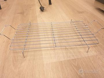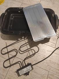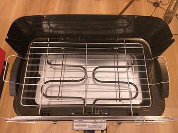 2200 W, misure montato 50 x 30 altezza 71, si può usare senza gambe su qualsiasi piano d'appoggio. Griglia regolabile a 3 altezze, completamente smontabile per la pulizia