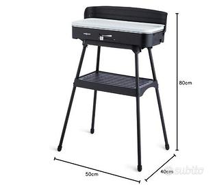 potenza massima di 2200W, con manopola che permette di regolare la temperatura di cottura; possibilità di doppio utilizzo, come griglia da tavolo, oppure da esterno con la presenza di un piede di supporto rimovibile con quattro gambe per l'appoggio a terra; vassoio in plastica per la raccolta del grasso, lavabile in lavastoviglie; protezione dal vento; contenitore adatto agli utensili occorrenti alla cottura, da fissare al piede; piastra rivestita in ceramica, per evitare segni di bruciatura e per garantire una pulizia semplice.