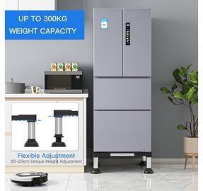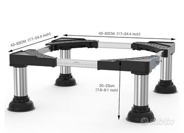 Base per lavatrice dotata di 4 piedini, lunghezza/larghezza può essere regolata da 43-62 cm su entrambi i lati, con un aumento di 20-23 cm di altezza e una capacità di carico fino a 300 kg, che è un scelta ideale. se hai un frigorifero, una lavatrice, un'asciugatrice, un congelatore, una fioriera, un armadio o altri mobili.