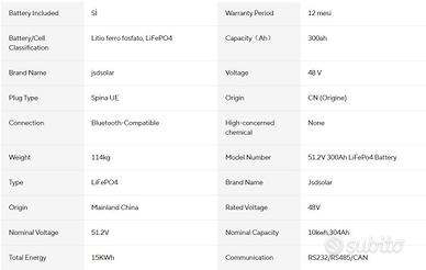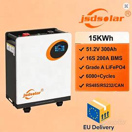 BATTERIE AL LITIO JSDSOLAR PER IMPIANTO FOTOVOLTAICO MODELLO DA 5 KWh = 760 EURO COMPRESO DI SPEDIZIONE MODELLO DA 10 KWh = 1300 EURO COMPRESO DI SPEDIZIONE MODELLO DA 15KWh = 1430 EURO COMPRESO DI SPEDIZIONE Sconto per acquisti multipli. LiFePO4 48V 300Ah 15KWh 16S 200A BMS, Batteria Solare al Litio con oltre 6000 Cicli, Grado A, Batteria per Accumulo di Energia con Bluetooth Descrizione: Batteria LiFePO4 Jsdsolar 48V 300Ah 15KWh 16S 200A BMS Batteria al Litio Solare Portatile 6000+ Cicli Grado A Batteria di Accumulo di Energia Bluetooth per Uso Domestico Tipo di batteria: LiFePO4 Tensione Normale: 51,2V Capacità normale: 304 Ah Corrente massima di carica/scarica: 200A Ciclo di vita: >6000 cicli Batteria di grado A: sì Interfaccia di comunicazione: CAN/RS232/RS485 Installazione: Alimentazione a parete Certificati: CE, ROHS, UN38.3, MSDS, ISO Dimensioni: 560*235*700 mm Peso: 115Kg Inverter: Compatibile con tutte le marche di inverter ibridi e off-grid del mondo Sicurezza e affidabilità:* Cella da 3,2 V 304 Ah ad alta densità di energia * Capacità popolare della batteria LiFePO4: 15 kWh * Lunga durata >6000 cicli * Carica e scarica più bilanciata tramite BMS intelligente * Flessibilità e compatibilità * Accumula energia dalla rete elettrica o dal solare * L'energia totale si estende a 225 kWh grazie a pacchi batteria in parallelo * Installazione: Batteria mobile * Monitora e ottimizza tramite app per smartphone / computer (opzionale)