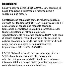 Descrizione Il nuovo aspirapolvere SEBO 360/460 ECO continua la lunga tradizione di successo dell'aspirapolvere a spazzola a due motori. Caratteristiche collaudate come la moderna spazzola elettrica per tappeti COMFORT con le quattro rotelle e il pratico tubo di aspirazione manuale con tubo telescopico permettono una pulizia professionale dei tappeti. Il sistema di filtraggio a 3 stadi significativamente migliorato con filtro HEPA nella zona di scarico soddisfa i requisiti elevati per l'emissione di polvere secondo la seconda fase della direttiva UE sulla progettazione ecologica per gli aspirapolvere (regolamento (UE) n. 665-666/2013). Il SEBO 360/460 è dotato dei tipici vantaggi di serie SEBO: il giunto autoscillante offre ancora più robustezza, il pratico sportello di pulizia, le spazzole intercambiabili e il design piatto garantiscono una comoda manipolazione e manutenzione. Pagata 450 ancora confezionata mai aperta