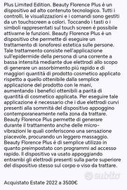 Tutti i controlli, le visualizzazioni e i comandi sono gestiti da un touchscreen a colori. Toccando i tasti o i simboli rappresentati sul touch screen è possibile attivarne le funzioni. Beauty Florence Plus è un dispositivo che permette di eseguire un trattamento di Ionoforesi estetica sulle persone.