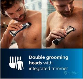 Prodotto nuovo al 100% nella scatola originale, mai usato Garanzia originale di 12 mesi MarchioPhilips Usi consigliati per il prodottoAscella, Gamba, Peli pubici, Peli sulla schiena Caratteristica specialeImpermeabile Sorgente di alimentazioneAlimentato a batteria Nome modelloBodygroom Rasoio Corpo Wet&Dry Componenti inclusiInclude: Philips Bodygroom serie 7000, astuccio di conservazione, spazzolina per la pulizia, cavo di ricarica e manuale utenteInclude: Philips Bodygroom serie 7000, astuccio di conservazione, spazzolina per la pulizia, cavo di ricarica e manuale utente Durata batteria80 Minuti Peso articolo290 grammi ColoreNero Materiale della lamaLega di acciaio Progettato per schiena, spalle, torace, addome, ascelle, braccia, zona inguinale e gambe 100% impermeabile, utilizzabile anche sotto la doccia Rasoio 4D- Testina realizzata con lamina ipoallergenica che si flette in 4 direzioni per adattarsi ai contorni del corpo