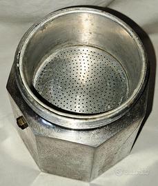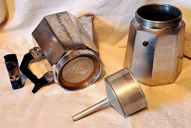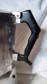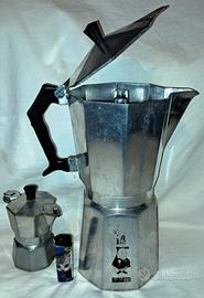 Bialetti Grande Caffettiera Moka Express 18 Tazze – particolare manico con doppio attacco- usata anni ‘80 N.B. L’oggetto e’ stato visionato dalla Bialetti a mezzo foto e mail ed e’ stato quindi con certezza catalogato e definito sia nell’ Epoca che nella capienza di 18 tazze. Di seguito la cortese risposta: “Gentile Cliente, buongiorno, La informo che la produzione di questa Moka Express risale a circa 40 anni fa prodotta circa negli anni 80 e corrisponde al modello da 18 tazze Servizio Clienti Bialetti Industrie S.p.A.” Made in Italia, anni ’80. Particolare e raro il doppio attacco del manico, caratteristica Bialetti dell’Epoca in questo modello. Sul fondo appare un triangolo con le lettere A, B e C (Alfonso Bialetti Crusinallo) presente la scritta A. Bialetti Crusinallo Made in Italy che ne certifica l’originalita’, la provenienza e la qualita’. Dimensioni: diametro di base cm 12, altezza cm 32, larghezza da becco a impugnatura compresi 22 cm circa La Moka da 18 tazze è stata usata ma è in buone condizioni. Integro l’omino Bialetti. L’interno della caldaia dell’acqua cosi’ come l’esterno presentano segni d’uso, la guarnizione brunita dal tempo e’ consigliabile cambiarla. Non testata ma munita di tutte le sue parti, pomello e manico con doppio attacco al corpo della Caffettiera in bakelite nera integri (vedi le numerose foto). Corpo in alluminio La Moka può essere utilizzata sia sui fornelli a gas che su fornelli elettrici. Non adatta a induzione. La Caffettiera Moka Bialetti da 18 tazze rappresenta l’iconico design italiano e la qualità superiore che solo Bialetti può offrire. Realizzata in alluminio di alta qualità, questa caffettiera è progettata per preparare un caffè ricco e aromatico, perfetto per soddisfare le esigenze di grandi famiglie o per ospitare eventi sociali. La piccola caffettiera da 3 tazze accanto nelle foto non fa’ parte della vendita e' inserita per dare una migliore idea delle grandi dimensioni della Moka - Articolo raro -