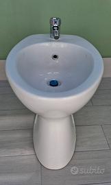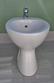 Bidet distanziaro, a terra, in ceramica bianco lucido. Mai utilizzato, Nuovo di zecca. Completo di rubinetteria nuova, cromata, con flessibili e canotto di scarico.