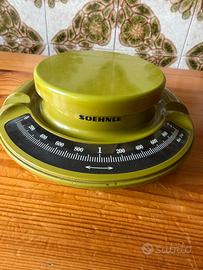 Bilancia da cucina vintage Soehnle degli anni '70, riconoscibile per il suo design retrò verde e il contenitore rimovibile.