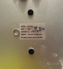 Dimensioni circa 20*15 cm Digitale Due tasti, possibilità di cambio unità di misura Sensibilità 1 g Max 3 kg Richiede due pile AAA (incluse)
