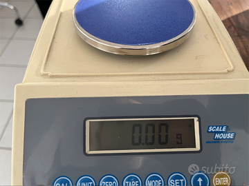 Bilancia tecnica di precisione con funzione conta pezzi. Marca Scale House, modelllo HLD300. Perfettamente funzionante, usata pochissimo. Attenzione, l'involucro dell'alimentatore è leggermente crettato come in foto. Max 300g d 0,005 g Linearità 0,01 g (+/-) Ripetibilità 0,005 g Sensibilità interna g 0,0005 P.M.U. min. raccomandato g. 0,005 CARATTERISTICHE TECNICHE - Display LCD retroilluminato a 7 cifre da 16 mm; - Tastiera impermeabile a membrana, con feedback acustico, a 7 tasti; - Piatto in acciaio Inox Ø 120mm; - Paravento, bolla di livello e piedini regolabili; - Batteria interna ricaricabile (autonomia 30h circa) e alimentatore 230Vac; - Porta RS232/C per collegamento a PC o stampante; - omologazione CE-M in classe III. FUNZIONI - conteggio pezzi; - pesata %; - totalizzazione peso; - conversione fino a 13 unità di misura; - azzeramento; - inseguimento di zero; - tara semiautomatica; - calibrazione digitale; - attivazione retroilluminazione; - avviso batteria scarica.
