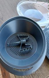 Vendo bimby tm 31 nuovo mai usato con Boccale In acciaio inossidabile con una capacità di 2 litri per liquidi, adatto a impastare fino a 650 g di farina. Motore: Motore a riluttanza Vorwerk con potenza nominale di 500 W. La velocità è regolabile gradualmente da 100 a 10.200 giri/min (velocità Soft a 10). Riscaldamento: Potenza assorbita di 1000 W, con protezione contro il surriscaldamento. La temperatura è regolabile manualmente dai 37°C ai 100°C (con scatti predefiniti) e include la funzione Varoma per la cottura a vapore. Bilancia Integrata: Pesa da 5 g a 2,0 kg (max 6,0 kg totali). Funzioni Speciali: Modalità Spiga: Per impastare pane, pizza e dolci. Funzione Antiorario: Per mescolare senza tagliare gli ingredienti. Soft: Per un rimescolamento delicato durante la cottura. Dimensioni e Peso: Circa 30 cm (A) x 28,5 cm (L) x 28,5 cm (P), con un peso di circa 6,3 kg (senza Varoma). Si effettuano spedizioni a carico dell acquirente no affaristi e no perditempo solo gente seria grazie .