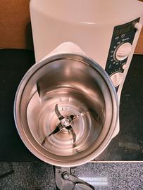 Bimby TM21, plastiche integre, boccale in ottimo stato, bilancia funzionante, timer funzionante e motore funzionante, però non scalda. Gruppo coltelli un po' rumoroso ma fa il suo dovere, nel vano del boccale come si può vedere dalla foto si è staccata un po' di vernice e manca il bicchierino . Anche se è funzionante quasi del tutto lo vendo come non funzionante per non avere problemi. Da usare come ricambi oppure da sistemare.