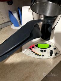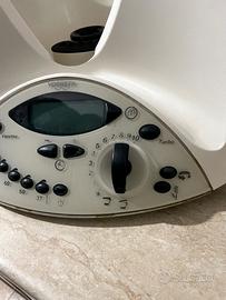 Bimby Vorwerk TM31 funziona perfettamente ma ci sono alcune parti da sostituire. Mascherina tasto + rotto(ma funziona) gruppo lame un po’ rumorose ma funzionano coperchio rotto in un angolo i tasti temperatura 60/90 gradi premendo si sente il click ma non accende il led però la temperatura funziona benissimo come visibile in foto per il resto è perfetto. Insieme al Bimby vendo solo il varoma senza vassoio. Lo vendo per parti dí ricambio o per chi vuole sistemarlo ma è tranquillamente utilizzabile anche così.
