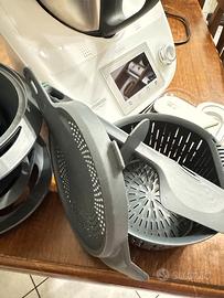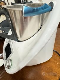 Vendo Bimby TM5 è tenuto benissimo con accessori aggiuntivi comprati in un secondo momento spatola, misurino, paraschizzi completo di cook-key,varoma , cestello Presenta un unico difetto che non influisce sul funzionamento sulla scocca, come riportato nella foto. Funziona perfettamente e come si vede tenuto molto bene, anche le scritte sono intatte.
