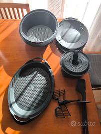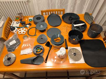 Bimby TM6 come nuovo, usato ma ben tenuto, dotato di accessori originari (kit varoma, spatola, cestello, farfalla), più una ricca dotazione di altri accessori, come affettatutto, spremiagrumi, scolapasta, rimuovi impasto, cuociuova, copertura delle lame, deviatore di vapore, vassoio, copriboccale, guarnizioni, base di aggancio del boccale, accessorio per spezie, tisane, tè ed altro.
