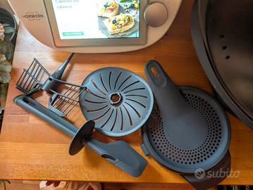 Completo di tutti gli accessori di serie originali (Varoma completo, cestello, paraschizzi, farfalla, spatola, coperchio e tappo) più coprilame.