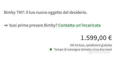 Vendo BIMBY TM7 a rate cosi come sono le rate che sto pagando. Inoltre insieme a questo vendo l’affettatutto e lo regalo. Quindi invece di 1800€ vendo tutto a 1500€. Per foto originali, scrivetemi in privato e vi manderò tutto.
