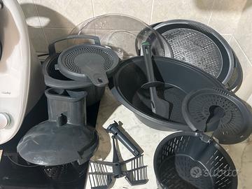 Dotato di tutte le componenti principali con varoma, spatola, cestello, farfalla, affetta tutto, paraschizzi, copri lame, libro di ricette “Idee Gustose”, libro di istruzioni e libro guida per l’utilizzo del coprilame.