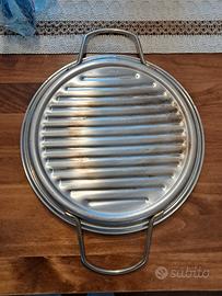 Nuovissima bistecchiera rotonda in acciaio inox di fabbricazione italiana " Inoxriv". È stata usata al massimo 2 volte. Diametro 29 cm. Larghezza da un manico all altro di 41 cm