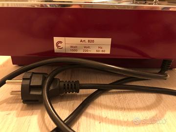 Nuova mai usata, ottima bistecchiera elettrica marca CF mod. 820, 1500 watt, in acciaio inox con vaschetta raccogligocce, griglia doppia apribile in acciaio cromato.