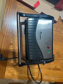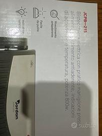 Bistecchiera elettrica con pratico maniglione pressa alimenti ca estimento antiaderente, indicazioni di accenstene e temperatura, potenza 800W.