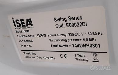 Boiler Scaldabagno Elettrico ISEA Swing, mod.50VE, Verticale, Capacità 50 Lt, Potenza elettrica 1200 W,con staffa di montaggio a parete. RITIRO a VS CARICO, Roma zona Torre Maura. Per info Sergio 351.8484624