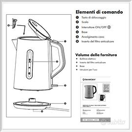 Questa inserzione si riferisce alla vendita di un Bollitore elettrico 220 Volt, marca Silvercrest e modello SWKO 3000 J3. Il bollitore è nuovo, con confezione sigillata ed è quello visualizzabile nelle foto dell’inserzione, le foto quindi sono parte integrante della descrizione. Descrizione: - Capacità: max. 1,7 l; - Potenza: 3000 W; Caratteristiche: - Corpo in acciaio inox di alta qualità; - Base a capsula in acciaio inox con elemento riscaldante nascosto; - Porta a ebollizione 1 litro d'acqua in circa 2 minuti e 45 secondi; - Pulsante di sblocco del coperchio per l'utilizzo con una sola mano; - Base girevole a 360°; - Spegnimento automatico e protezione contro il funzionamento a secco; - Indicatore del livello dell'acqua e filtro anticalcare rimovibile; - Avvolgicavo integrato. Specifiche Tecniche del prodotto: - Capacità: max. 1,7 L; - Materiale: Acciaio inossidabile; - Potenza: 3000 W; - Tempo di ebollizione: 1 L di acqua in circa 2 minuti e 45 secondi; - Coperchio: Con pulsante di apertura coperchio; - Apertura coperchio con una sola mano: Sì; - Protezione da surriscaldamento e incrostazioni: Sì; - Bollitore: Base a capsula in acciaio inossidabile con elemento riscaldante nascosto; - Filtro anticalcare: Rimovibile; - Indicatore del livello dell'acqua: Sì; - Lunghezza cavo: 75 cm. Dimensioni: - Circa 22 x 24 x 16 cm (L x A x P). Peso: - Circa 900 grammi. Contenuto della confezione: - 1x bollitore Silvercrest SWKO 3000 J3; - 1x Inserto del filtro anticalcare; - 1x Base; - 1x Manuale istruzioni.