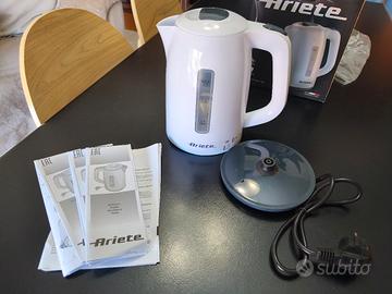 Bollitore elettrico Ariete senza fili, bianco e grigio, nuovo e mai usato nella sua confezione originale. Livello acqua visibile.
