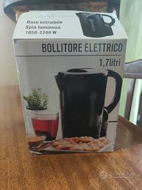 Bollitore elettrico nero con base estraibile e spia luminosa. Nuovo mai usato, con imballaggio originale. - Capacità: 1,7 litri - Potenza: 1850-2200 W - Base estraibile - Spia luminosa