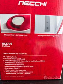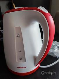 bollitore in ottime condizioni, capacità di 1,7 litri marca Necchi, con scatola originale. sull' esterno aveva una scritta Only water no Milk , leggermente visibile Usato poco...era in una casa vacanze chiusa dopo pochi mesi per motivi privati.